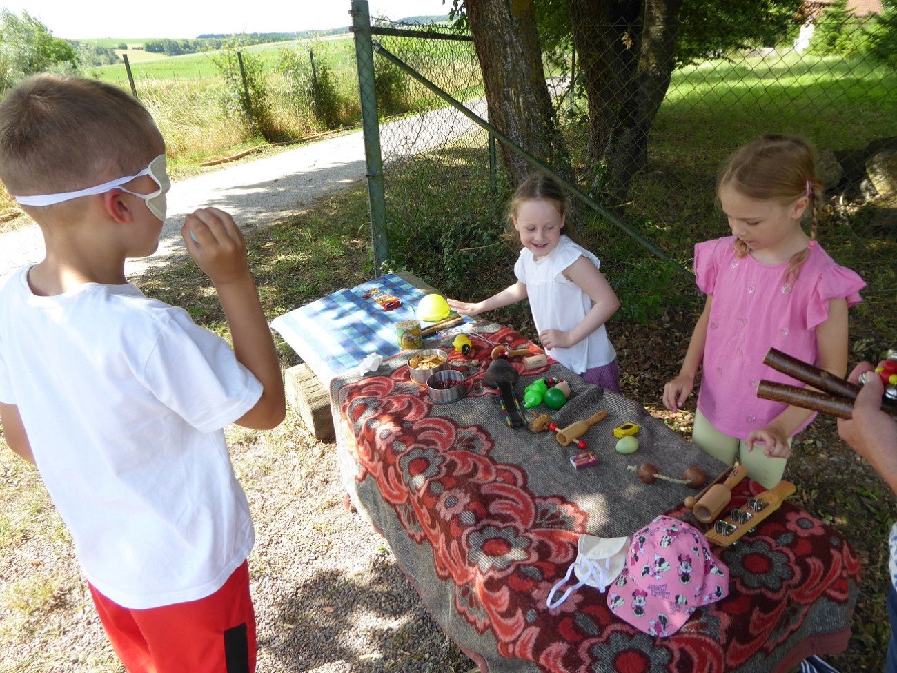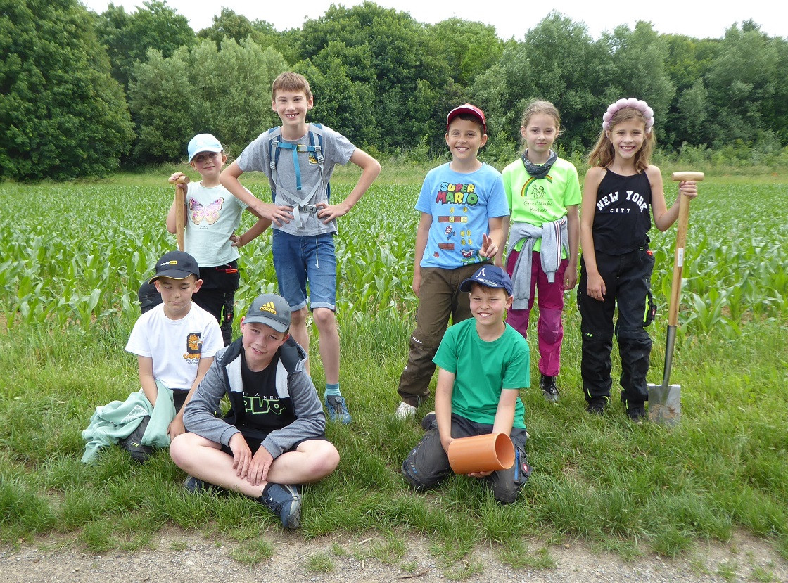 Einige Erstklässler trafen sich für eine schöne kleine Wanderung mit verschiedenen Spielen z.B. einem 25 Meter Lauf, bei dem die Kinder es schafften, so schnell zu rennen wie z. B. eine Honigbiene, oder ein Schmetterling fliegen kann. Oder es wurde gelauscht, welche Geräusche den gleichen Klang haben. Viel Spaß machte es mit den Lupengläsern verschiedenen Insekten auf der Wiese erkunden.